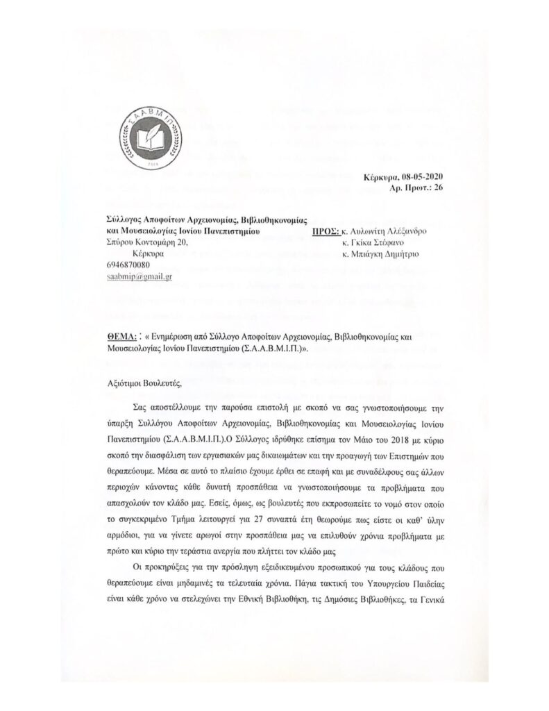 Επιστολή ΣΑΑΒΜΙΠ προς Βουλευτές Ν. Κερκύρας
